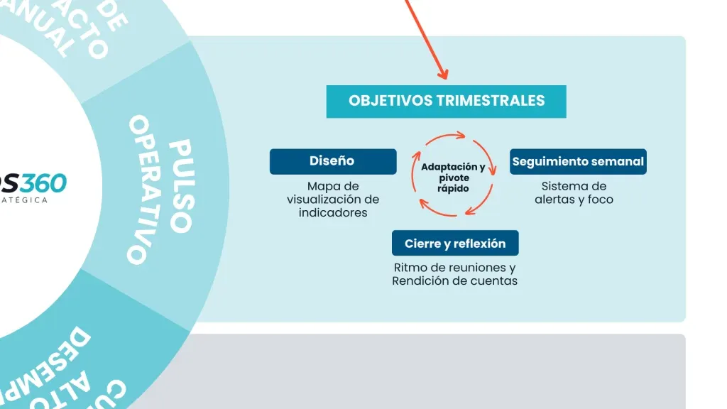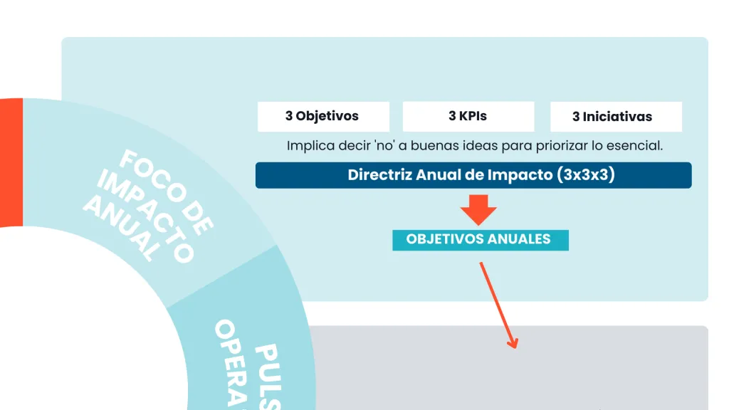 La Directriz Anual de Impacto (3x3x3) fuerza disciplina de priorización: máximo 3 Objetivos corporativos, 3 KPIs clave, 3 Iniciativas estratégicas por año. Estos se descomponen trimestralmente en OKRs más granulares con seguimiento semanal. No es simplificación por comodidad. Es concentración de energía organizacional en lo que realmente mueve la aguja del negocio.